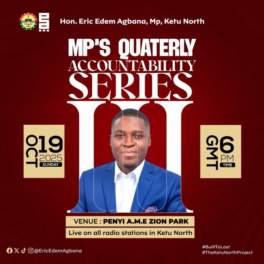 Mr. Eric Edem Agbana, the Member of Parliament (MP) for Ketu North, is scheduled to hold his third edition of the Quarterly Accountability Series on Sunday, October 19, 2025, at Dzodze Penyi.