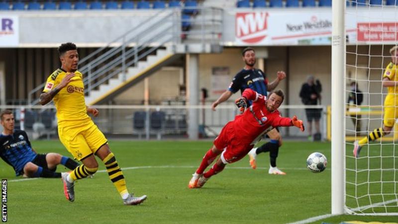 England’s Jadon Sancho scored the first hat-trick of his career on his first start since the Bundesliga resumed as Borussia…